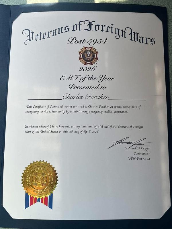Captain Foraker was named Emergency Medical Technician (EMT) of the Year by the VFW Post 5954 in Red Hill